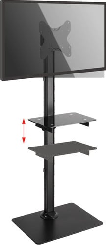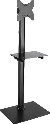 Supporto da pavimento con mensola in vetro adatta per appoggiare un dispositivo audio-video.