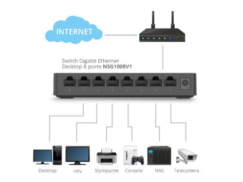 Lo switch Gigabit ethernet NSG1008V1 a otto porte è ideale per reti domestiche e ufficio dette anche Small Office Home Office (SOHO).