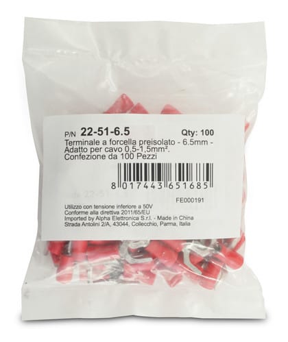 ALPHA ELETTRONICA - Terminale a forcella preisolato - 6,5mm - Adatto per cavo 0,5-1,5mm² 22-51-6.5