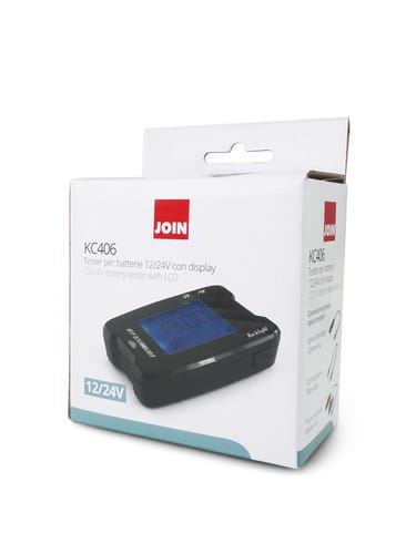 Il tester per batterie KC406 permette di visualizzare la tensione della batteria collegata tramite cavo accendisigari oppure cavo con morsetti a coccodrillo oppure, per un montaggio fisso, tramite cavo con occhielli.