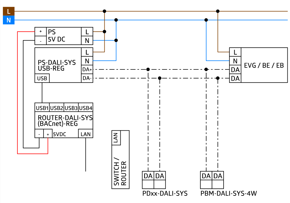 Router con WEB server integrato e controller dell'applicazione per il montaggio su guida DIN EN 60715, 4 porte USB per controllare fino a 4 separati Controller B.E.G. con alimentatore DALI integrato, 1 porta LAN per collegare in rete fino a 100 dispositivi, fino a 400 linee DALI interconnesse , Gestione centralizzata dei parametri, indirizzi, gruppi e scene per tutti i componenti DALI in rete, Logica applicativa decentralizzata in multisensori e pulsanti: il router assume solo funzioni di livello superiore, Gestione degli utenti e delle autorizzazioni per ruoli diversi, Gestore lampade di emergenza DALI, Funzione di luce guida estesa (su tutte le linee DALI), Funzione di routing degli eventi per realizzare scenari di illuminazione interlinea tra linee DALI diverse, Funzione Update Manager, per l'aggiornamento del firmware del router tramite LAN / WAN, Può essere gestito tramite web browser compatibile e qualsiasi dispositivo (smartphone, tablet, PC), Strumenti di diagnosi e analisi del consumo di energia e per la ricerca di guasti, Monitoraggio della temperatura del processore principale e dell'involucro, Ventola di alta qualità con controllo automatico della velocità, Orologio in tempo reale integrato, Visualizzazione LED dello stato, Incluso alimentatore da 5 VDC / 2 A er montaggio su guida DIN (1TE) fornito in involucro separato, Inclusi 4 cavi di collegamento USB (0,5 m) e 1 cavo LAN (0,5 m), Supporto B.E.G. alla proggettazione gratuito, Supporto per la messa in servizio da parte di B.E.G. a pagamento, Assistenza e manutenzione da remoto tramite una connessione VPN esistente o una fornita da B.E.G., Piccoli lavori di manutenzione (ad esempio la sostituzione degli apparecchi di illuminazione) possono essere eseguiti in autonomia da un tecnico o da un installatore elettrico locale