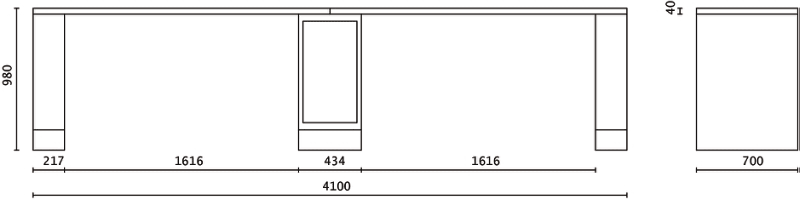 Con piano da lavoro 4100x700 mm rivestito da uno strato di PVC antiurto e antigraffio resistente agli idrocarburi - Fori per la collocazione di una morsa 1599F/150 - 1599GI/150 (da ordinare separatamente) - Piedini regolabili in altezza - Gamba doppia centrale con vano-portaoggetti e sportello di chiusura 365x750 mm 365x750 mm