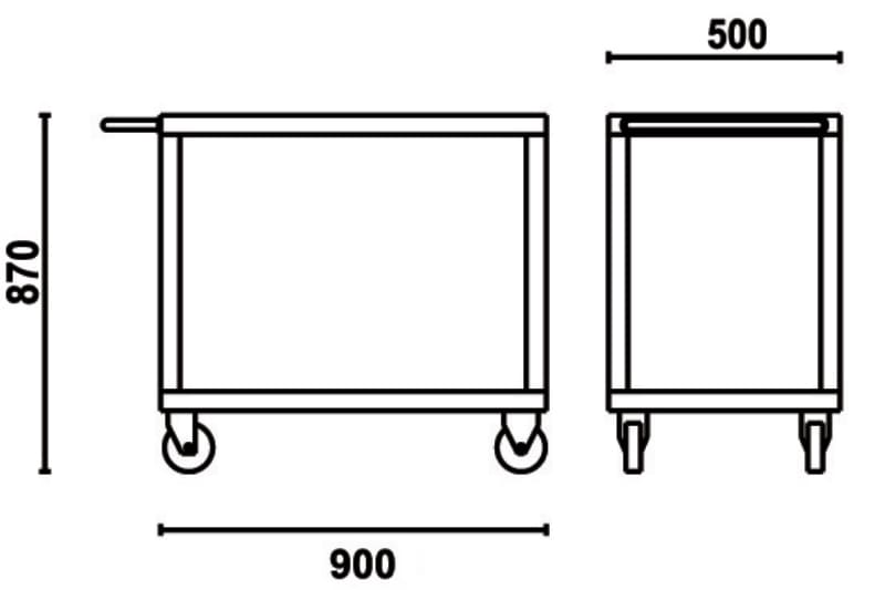 - 2 ripiani ricoperti da tappetini in gomma - Maniglia ergonomica - Quattro ruote Ø 125 mm ad alta resistenza: 2 fisse e 2 girevoli con freno - Capacità di carico statico: 750 kg. (distribuita sui 2 ripiani) 900x500x870 mm