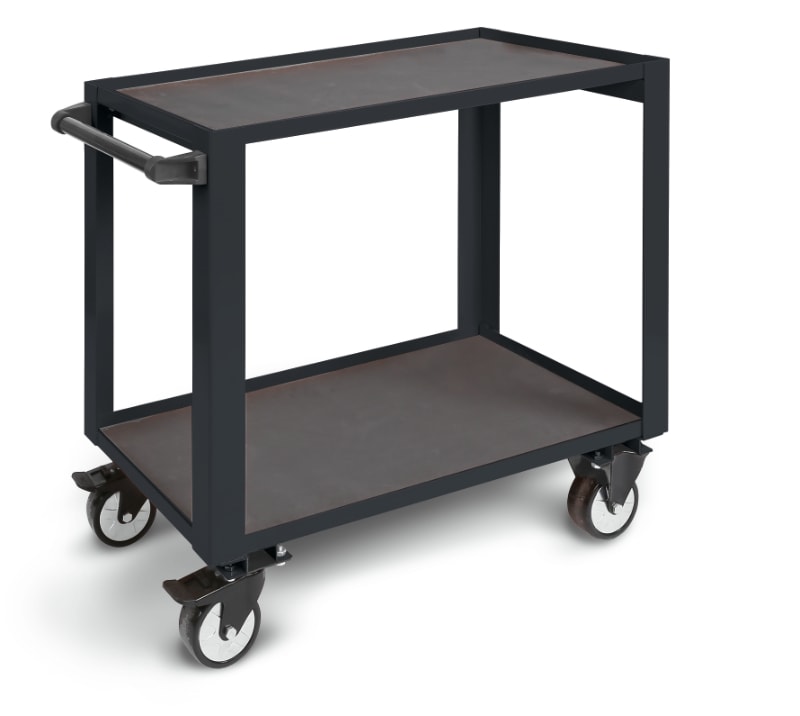 - 2 ripiani ricoperti da tappetini in gomma - Maniglia ergonomica - Quattro ruote Ø 125 mm ad alta resistenza: 2 fisse e 2 girevoli con freno - Capacità di carico statico: 750 kg. (distribuita sui 2 ripiani) 900x500x870 mm