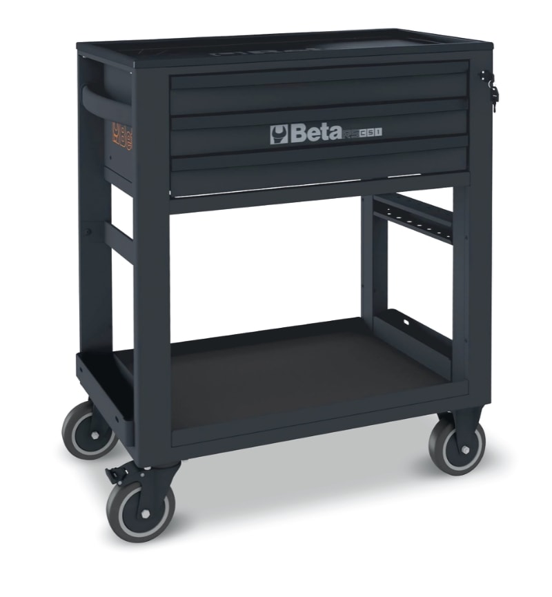 Completamente rinnovato ed accessoriabile, il carrello da lavoro Beta RSC51 è indispensabile per lavorare con la massima praticità. Caratteristiche principali: - Piano di lavoro rinforzato in ABS, solido e robusto - Piano di appoggio multifunzione con bordi anticaduta e 8 fori per l\'alloggiamento dei giravite - 3 cassetti da 588x367 mm, montati su guide telescopiche a sfera, altezza 70 mm - Piano dei cassetti protetto da tappetini di gomma espansa - Possibilità di inserire in ogni cassetto fino a 4 vassoi morbidi in EVA o termoformati rigidi in ABS - Serratura di sicurezza centralizzata frontale - Pratico portagiravite laterale incluso - Due portabombolette laterali integrati nella struttura - Ampio ripiano inferiore protetto con tappetino in gomma antiolio e antibenzina - Quattro ruote Ø 125 mm: 2 fisse e 2 girevoli (una con freno) - Capacità di carico statico: 400 kg - Portata singolo cassetto: 15 kg uniformemente distribuiti Accessori integrabili: - Piano di lavoro in legno 2400 RSC24/PL - Pannello forato portautensili 2400 RSC24/PF - Supporto porta computer 2400 RSC24/SPC - Mensola pieghevole 2400 RSC24/MP - Portacarta per rotoli preforati 2400 RSC24/PC-A