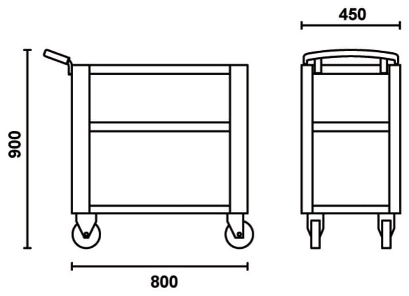 Caratteristiche: - 3 ripiani ricoperti in gomma millerighe antiscivolo - Maniglia ergonomica - Doppia possibilità di fissaggio del ripiano centrale - Quattro ruote Ø 100 mm: - 2 fisse e 2 girevoli (una con freno) - Capacità di carico statico: 200 kg (distribuita sui 3 ripiani)