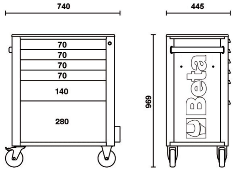 La cassettiera portautensili Beta RSC24A/6 è l\'evoluzione della storica cassettiera C24SA, progettata per soddisfare le esigenze di ogni professionista. La struttura robusta e i materiali impiegati garantiscono un\'elevata qualità e una lunga durata nel tempo. Il design, ispirato al mondo Racing, conferisce alla cassettiera uno stile accattivante e inconfondibile. RSC24A/6 è disponibile in 3 colorazioni diverse e personalizzabile al massimo, grazie all\'ampia gamma di accessori disponibili. Modello 6 cassetti da 588x367 mm ad estrazione totale, montati su guide telescopiche a sfera: - 4 cassetti altezza 70 mm - 1 cassetto altezza 140 mm - 1 cassetto altezza 280 mm Caratteristiche: - Piano di lavoro rinforzato in ABS, solido e robusto - Piano di appoggio multifunzione con bordi anticaduta e 8 fori per l\'alloggiamento dei giravite - 4 ruote Ø 125 mm di cui 2 fisse e 2 girevoli (una con freno) - Serratura di sicurezza centralizzata frontale - Capacità di carico statico pari a 800 kg - Porta flaconi laterale integrato, applicabile su entrambi i lati - Piano dei cassetti protetto da tappetini di gomma espansa - Possibilità di inserire in ogni cassetto fino a 4 vassoi morbidi in EVA o termoformati rigidi in ABS Accessori integrabili: - Piano di lavoro in legno 2400 RSC24/PL - Pannello forato portautensili 2400 RSC24/PF - Supporto porta computer 2400 RSC24/SPC - Mensola pieghevole 2400 RSC24/MP - Porta documenti 2400 RSC24/PD (grigio antracite oppure nero) - Portacarta per rotoli preforati 2400 RSC24/PC (grigio antracite oppure nero)