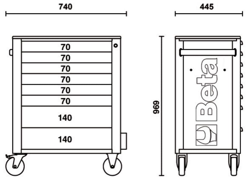 La cassettiera portautensili Beta RSC24A/8 è l\'evoluzione della storica cassettiera C24SA, progettata per soddisfare le esigenze di ogni professionista. La struttura robusta e i materiali impiegati garantiscono un\'elevata qualità e una lunga durata nel tempo. Il design, ispirato al mondo Racing, conferisce alla cassettiera uno stile accattivante e inconfondibile. RSC24A/8 è disponibile in 3 colorazioni diverse e personalizzabile al massimo, grazie all\'ampia gamma di accessori disponibili. Modello 8 cassetti da 588x367 mm a estrazione totale, montati su guide telescopiche a sfera: - 6 cassetti altezza 70 mm - 2 cassetti altezza 140 mm Caratteristiche: - Piano di lavoro rinforzato in ABS, solido e robusto - Piano di appoggio multifunzione con bordi anticaduta e 8 fori per l\'alloggiamento dei giravite - 4 ruote Ø 125 mm di cui 2 fisse e 2 girevoli (una con freno) - Serratura di sicurezza centralizzata frontale - Capacità di carico statico pari a 800 kg - Porta flaconi laterale integrato, applicabile su entrambi i lati - Piano dei cassetti protetto da tappetini di gomma espansa - Possibilità di inserire in ogni cassetto fino a 4 vassoi morbidi in EVA o termoformati rigidi in ABS Accessori integrabili: - Piano di lavoro in legno 2400 RSC24/PL - Pannello forato portautensili 2400 RSC24/PF - Supporto porta computer 2400 RSC24/SPC - Mensola pieghevole 2400 RSC24/MP - Porta documenti 2400 RSC24/PD (grigio antracite o nero) - Portacarta per rotoli preforati 2400 RSC24/PC (grigio antracite o nero)