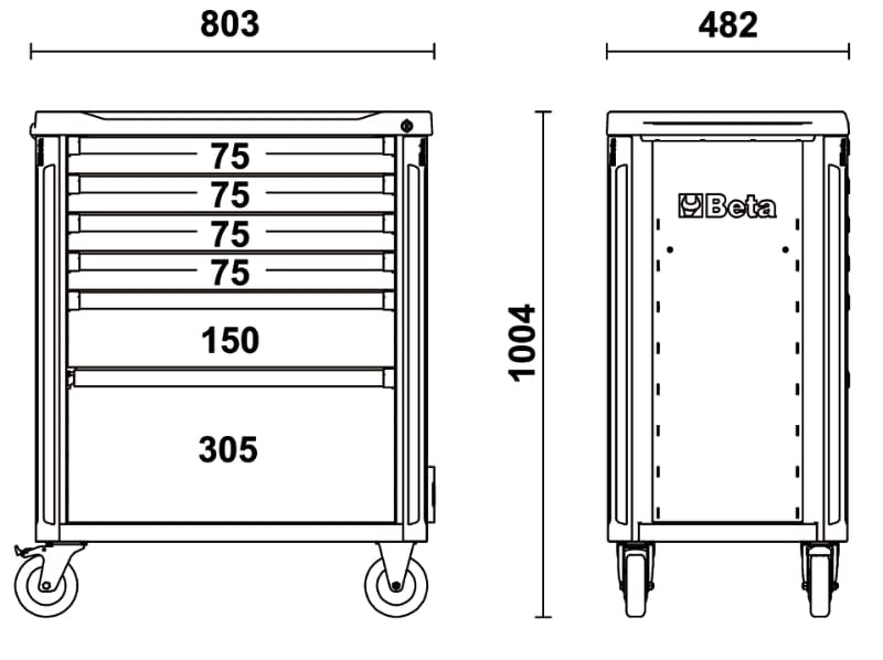 Cassettiera portautensili Beta con 6 cassetti da 588x367mm, montati su guide telescopiche a sfera: - 4 cassetti altezza 75 mm - 1 cassetto altezza 150 mm - 1 cassetto altezza 305 mm Caratteristiche: - Piano di lavoro multifunzione ad alta resistenza - Portaminuterie e fori per l\'alloggiamento dei giravite - Sistema di apertura a sgancio rapido in alluminio posizionato su tutta la lunghezza del cassetto - Paracolpi angolari morbidi su tutta l\'altezza della cassettiera per evitare, in caso di urto, danni agli oggetti circostanti - Piano dei cassetti protetto da tappetini di gomma espansa - Quattro ruote Ø 125 mm di cui 2 fisse e 2 girevoli (una con freno) - Serratura di sicurezza centralizzata frontale - Capacità di carico statico pari a 1.000 kg - Portaflaconi e portacarta laterali integrati, regolabili in più posizioni