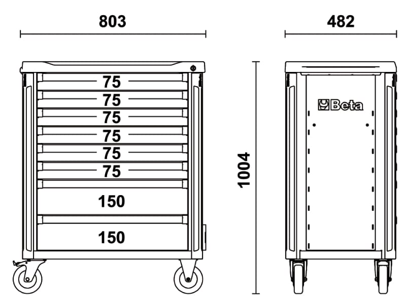Cassettiera portautensili Beta con 8 cassetti da 588x367 mm, montati su guide telescopiche a sfera: - 6 cassetti altezza 75 mm - 2 cassetti altezza 150 mm Caratteristiche: - Piano di lavoro multifunzione ad alta resistenza - Portaminuterie e fori per l\'alloggiamento dei giravite - Sistema di apertura a sgancio rapido in alluminio posizionato su tutta la lunghezza del cassetto - Paracolpi angolari morbidi su tutta l\'altezza della cassettiera per evitare, in caso di urto, danni agli oggetti circostanti - Piano dei cassetti protetto da tappetini di gomma espansa - Quattro ruote Ø 125 mm di cui 2 fisse e 2 girevoli (una con freno) - Serratura di sicurezza centralizzata frontale - Capacità di carico statico pari a 1000 kg - Portaflaconi e portacarta laterali integrati regolabili in più posizioni