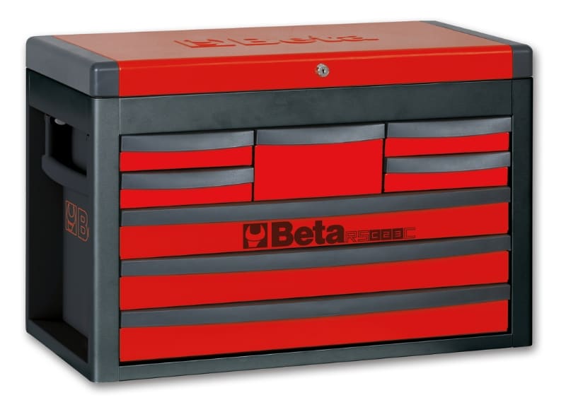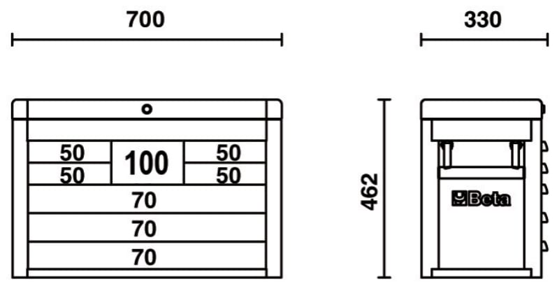 Cassettiera portautensili Beta con 8 cassetti da 588x277 mm, montati su guide telescopiche a sfera: - 4 cassetti altezza 50 mm - 3 cassetti altezza 70 mm - 1 cassetto altezza 100 mm Caratteristiche: - Serratura centralizzata frontale - Maniglie laterali a scomparsa per trasportarla facilmente