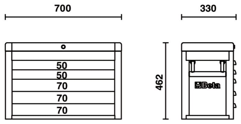 Cassettiera portautensili Beta con 5 cassetti da 588x277 mm, montati su guide telescopiche a sfera: - 2 cassetti altezza 50 mm - 3 cassetti altezza 70 mm Caratteristiche: - Serratura centralizzata frontale - Maniglie laterali a scomparsa per trasportarla facilmente