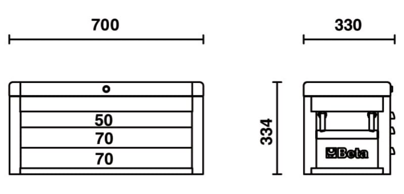 Cassettiera portautensili Beta con 3 cassetti da 588x277 mm, montati su guide telescopiche a sfera: - 1 cassetto altezza 50 mm - 2 cassetti altezza 70 mm Caratteristiche: - Serratura centralizzata frontale - Maniglie laterali a scomparsa per il trasporto
