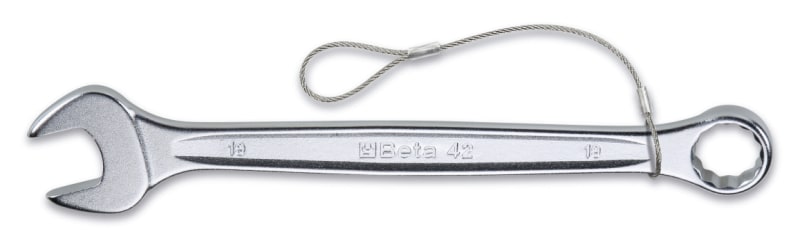 La chiave combinata Beta 42NEW ha un design ergonomico che la rende maneggevole e pratica da utilizzare in qualsiasi spazio. La qualità dei materiali selezionati e le tecniche di produzione utilizzate permettono di ottenere un prodotto altamente affidabile e durevole. La nichel-cromatura assicura un\'alta resistenza alla corrosione. Il trattamento termico applicato conferisce alla chiave un\'elevata tenacità perciò, anche nel caso di uso improprio, la chiave si deforma evitando rotture improvvise garantendo la massima sicurezza. Caratteristiche: - Dotata di sistema anticaduta H-SAFE con cavo che scorre lungo tutto il corpo dell\'utensile per un utilizzo pratico e sicuro - Forchetta inclinata di 15° per ridurre l\'angolo di ripresa - Poligono inclinato di 15° rispetto all\'asse per facilitare la presa della chiave quando lo spazio di manovra è limitato - Lunghezza della chiave superiore rispetto agli standard di mercato che permette di ottenere coppie elevate con sforzo minore - Spessori della forchetta ridotti al minimo per intervenire facilmente anche in spazi ristretti - Realizzata in acciaio legato