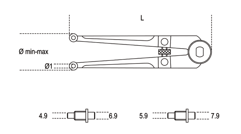 Chiavi a compasso con naselli tondi per ghiere con fori di manovra frontali cromate bruniti spine 5-6-7-8.