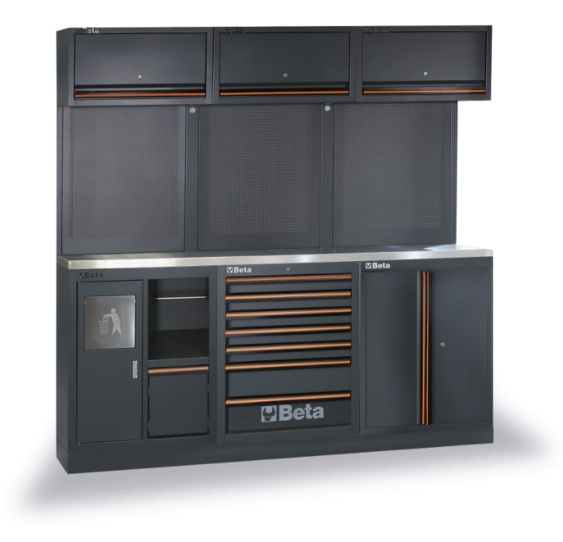 BETA - Combinazione arredo officina C45PRO con arredi pro a-2mt piano inox 3mod+pensili per un'organizzazione ottimale.