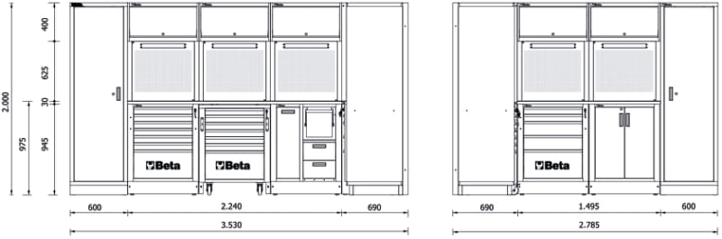BETA - Combinazione arredo officina RSC50 con arredi I - 3,5+2,7mt corner e armadi A1 per un'organizzazione ottimale.
