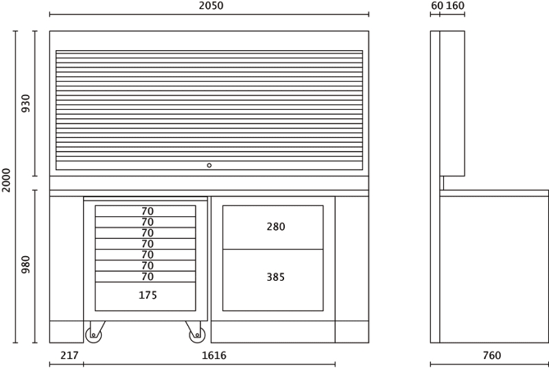 Combinazione composta da: - Banco da lavoro (C55BO/2) - Cassettiera mobile con 8 cassetti (C55C8) - Modulo fisso con 2 cassettoni (C55M2) - Parete portautensili con tapparella (C55PS-O) 2.05x2.00x0.76 m