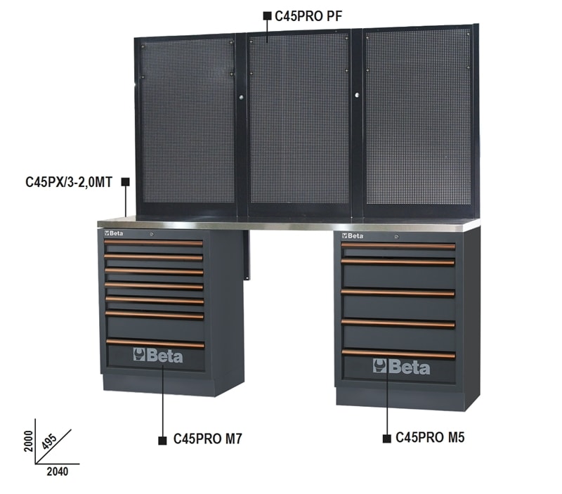BETA - Combinazione banchi arredo officina C45PRO con banchi pro piani inox 2,0mt 2mod+2pannel per un'organizzazione ottimale.