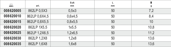 BETA - Inserti per avvitatori per viti a testa con intaglio ESAGONALI 1/4-L50 LP 0,5X3. 008620005