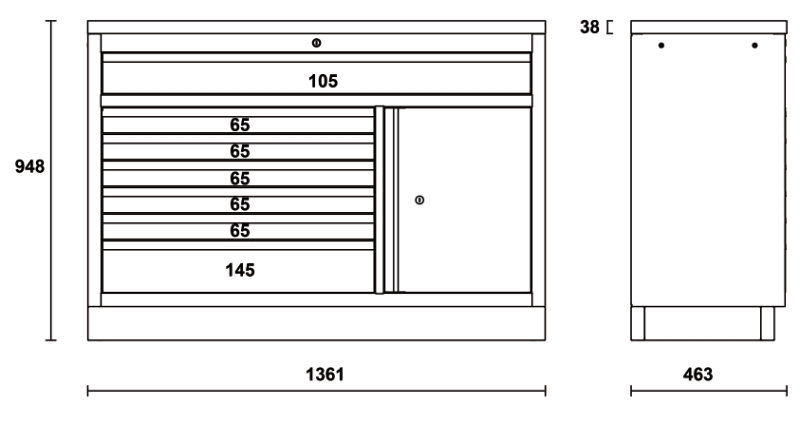 Caratteristiche: - Piano di lavoro da 1360mm in legno multistrato - 1 cassetto da 1248x406 mm, montato su guide telescopiche a sfera - 6 cassetti da 782x406 mm, montati su guide telescopiche a sfera: 5 cassetti altezza 65 mm 1 cassetto altezza 145 mm - Piano dei cassetti protetto da tappetini di gomma espansa - Serratura centralizzata frontale - Dotato di piedini regolabili in altezza - Predisposizione per l\'inserimento dei termoformati - 1 vano portaoggetti con ripiano intermedio e antina di chiusura, misure interne 504x424x597 mm - Possibilità di montaggio di una morsa 1599P/150 da ordinare separatamente