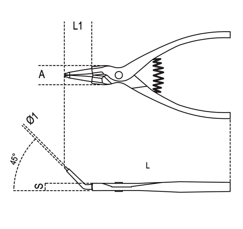 Pinze a becchi piegati a 45° per anelli elastici di sicurezza per alberi manici ricoperti in PVC, pinze becchi piegati 45gr per alb 140x13.