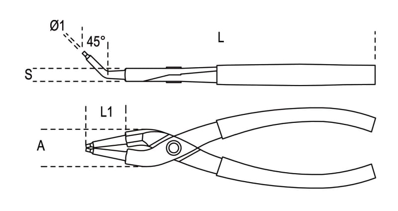 Pinze becchi piegati 45° per anelli elastici di sicurezza, fori manici ricoperti PVC 180.