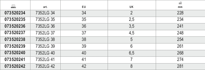 Tomaia:- Pelle pieno fiore ingrassata idrorepellente - Copripuntale di rinforzo in poliuretano - Inserto antiabrasione sul tallone Suola:- Intersuola in poliuretano espanso a basso peso specifico - Battistrada in gomma VIBRAM® ''Ranger'', resistente al calore da contatto HRO e per offrire il massimo delle prestazioni Puntale:Fibra di vetro, resistenza 200 joule Antiperforazione:Fibra composita con trattamenti ceramici Sottopiede:Tessuto nero accoppiato a PE ed EVA, materiale che non si deforma ritornando alla forma iniziale quando il piede viene estratto dalla calzatura. Forato in pianta per garantire maggiore traspirazione e dotato di inserto sul tallone ABS con densità differente per migliorare l\'assorbimento degli urti con il terreno. Peso:780 (g) Taglie:EU: 39-48 UK: 6-13