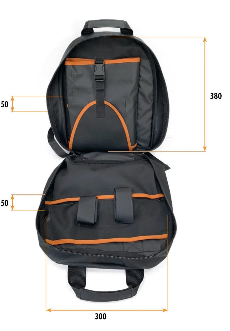 Caratteristiche: - Doppia maniglia sulla sommità centrale dello zaino per una presa sicura e bilanciata - Due ampie tasche frontali - Due capienti tasche interne e 2 fasce aggiuntive con velcro - Pratica busta avvolgibile interna, composta da 4 pannelli portautensili - Spallacci imbottiti rinforzati e regolabili - Carico massimo 15 Kg 310x120x390 mm - 0,9 Kg