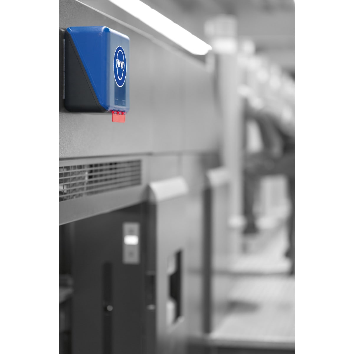 I dispenser consentono ai lavoratori di accedere rapidamente ai dispositivi di protezione individuale, Proteggi i tuoi DPI da sporco, umidità e polvere, Dispenser a pavimento o a parete, Con pittogramma ISO-7010 M004 È obbligatorio indossare protezioni per gli occhi