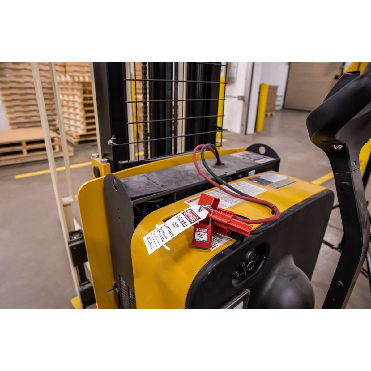 Per la sicurezza dei carrelli elevatori, il corretto funzionamento è un aspetto fondamentale, ma un lockout sicuro può essere altrettanto importante. Garantisci il lockout dei tuoi carrelli elevatori e altri mezzi di sollevamento bloccandoli i collegamenti in posizione aperta con il dispositivo di bloccaggio per connettori di alimentazione BatteryBlock™., Per l’uso con amperaggi da 175 A a 350 A