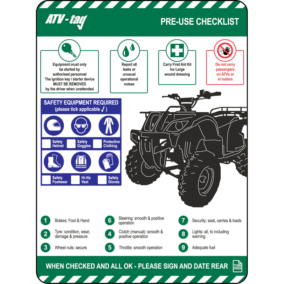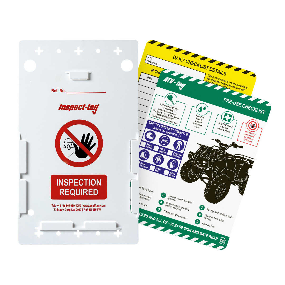 Inserto di stato ideato espressamente per aiutare a controllare le ispezioni frequenti, la manutenzione e l’identificazione degli ATV (Tutti i veicoli fuoristrada / Quad-bike). Gli inserti permettono di documentare fino a 32 ispezioni, sono resistenti alle intemperie e robusti, Il porta-inserti è fissato in modo permanente all’ATV in posizione ben visibile con una fascetta per cavi, un adesivo o un rivetto, Rimuovendo l’inserto, il porta-inserti indicherà immediatamente “Inspection Required” (Ispezione necessaria), L’inserto contiene una checklist prima dell’uso facile da seguire per gli operatori e permette di annotare fino a 32 ispezioni, Inserto pensato per l’uso con il porta-inserti “Inspection Required” (Ispezione necessaria), Resistente agli agenti atmosferici, all’acqua, alle sostanze chimiche e agli strappi