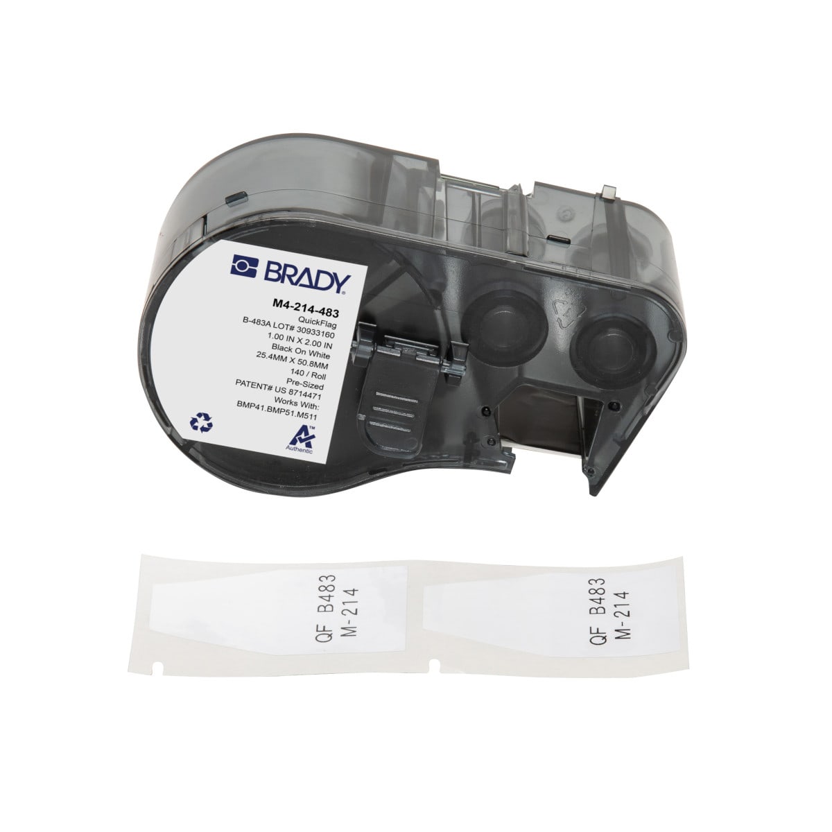 Identifica rapidamente fili e cavi con l’etichetta B-483 QuickFlag™, dallo speciale design rastremato per evitare bordi disallineati. Stampa praticamente ovunque con una stampante per etichette portatile Brady., Speciali: progettate (in attesa di brevetto) con lato adesivo rastremato per ottenere etichette a bandiera monofacciali per fili e cavi facili da applicare, senza bordi disallineati o adesivo esposto, Durevoli: realizzate in robusto poliestere resistente ad abrasioni, temperature da -40 a 120 °C e solventi come carburante, olio e acqua, Adesive: realizzate con adesivo ultra-aggressivo a base di gomma sul lato rastremato per un uso permanente, Certificazioni: UL Recognised secondo UL969, CSA Accepted, RoHS Compliant secondo 2011/65/UE (Pass 2015/863), Per le prestazioni e le proprietà specifiche del materiale, consulta la scheda tecnica (TDS)