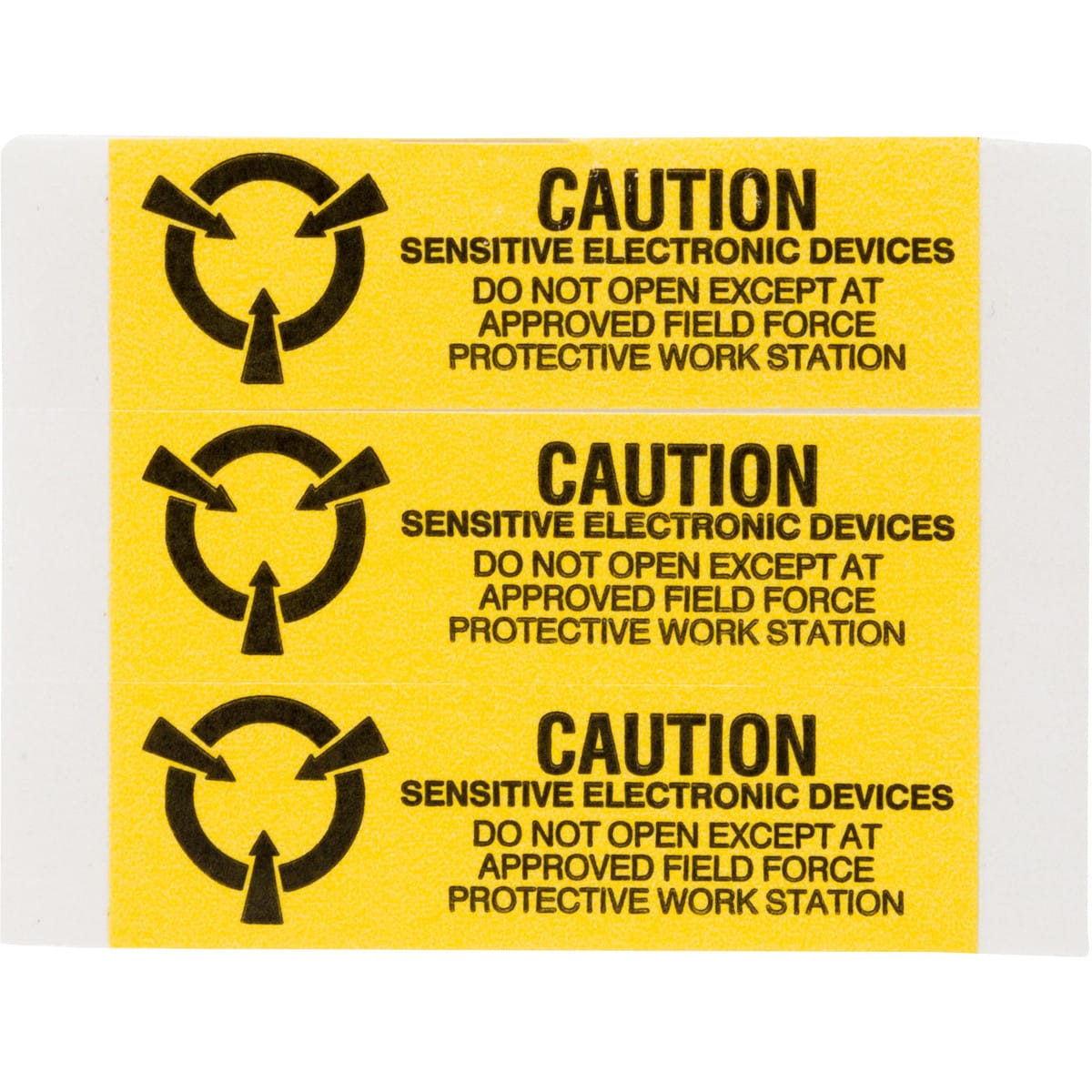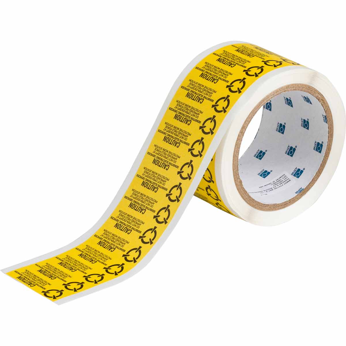 Queste etichette di sicurezza elettrostatica in rotolo segnalano a operatori e utilizzatori di dispositivi elettronici il rischio di danni provocati da scariche elettrostatiche. Simboli conformi allo standard miliare 129J e allo standard EIA (Electronics Industries Association) 471.