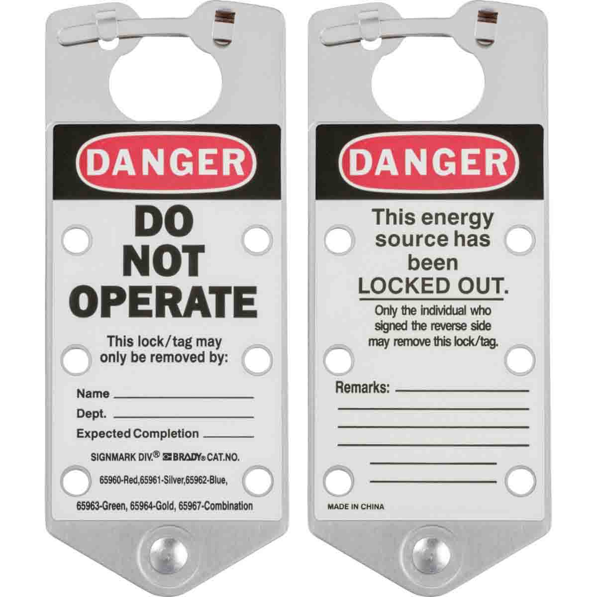 Realizzate in resistente lega di alluminio anodizzato 5052. Fornite con linguette di bloccaggio antimanomissione. Sulla superficie scrivibile dell'etichetta è possibile utilizzare matite, penne o pennarelli. Le scritte a penna o matita sono facilmente cancellabili, per cui il dispositivo è riutilizzabile. Fori per lucchetti da 8 mm., È possibile applicare 6 lucchetti