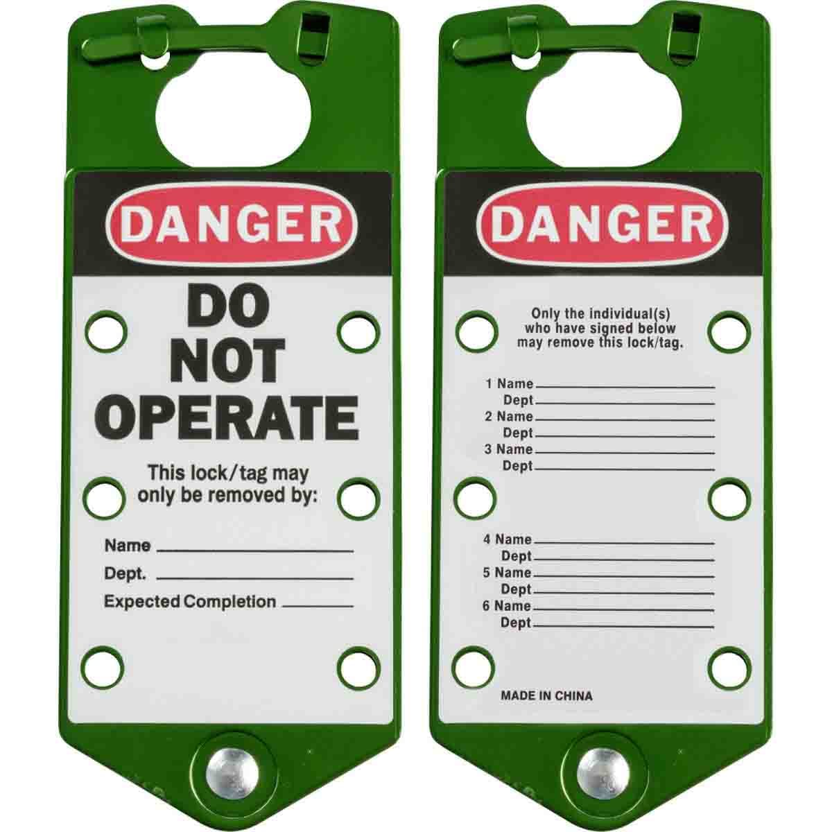 Realizzate in resistente lega di alluminio anodizzato 5052. Fornite con linguette di bloccaggio antimanomissione. Sulla superficie scrivibile dell'etichetta è possibile utilizzare matite, penne o pennarelli. Le scritte a penna o matita sono facilmente cancellabili, per cui il dispositivo è riutilizzabile. Fori per lucchetti da 8 mm., È possibile applicare 6 lucchetti
