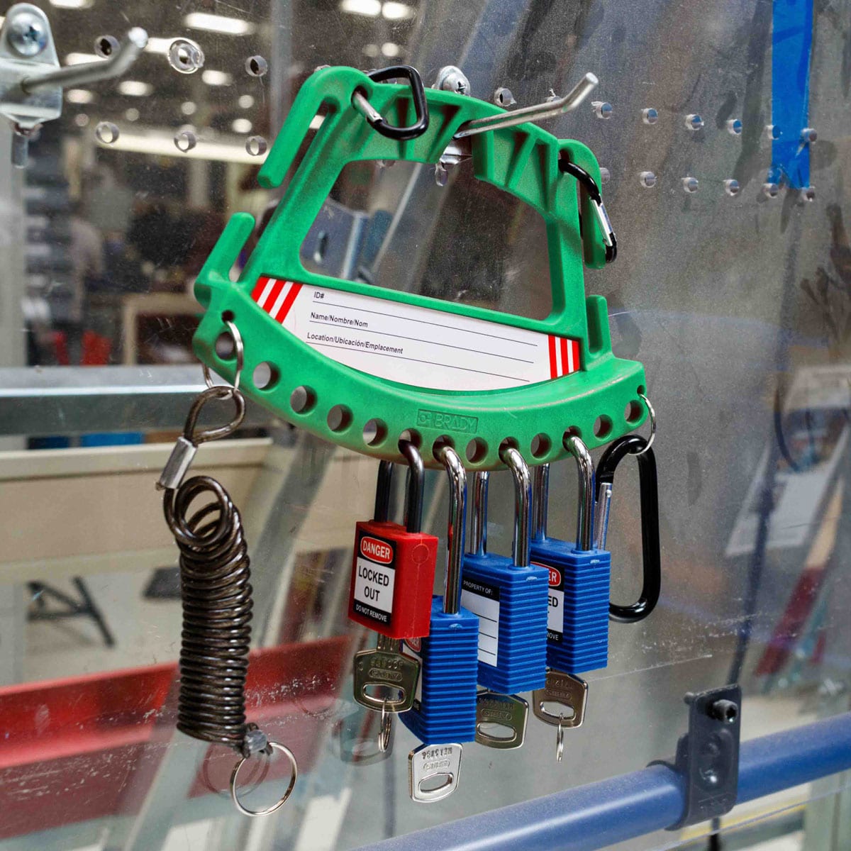 Il porta lucchetti di sicurezza e targhette, appositamente studiato per l’applicazione su macchinari e a parete, contiene fino a 12 lucchetti di sicurezza. Facilmente portabile a cintura, il sistema comprende moschettoni e un portachiavi a spirale per targhette, ganasce e chiavi dei lucchetti. Sono anche fornite etichette in inglese, spagnolo e francese e tre targhette per procedure di lockout.