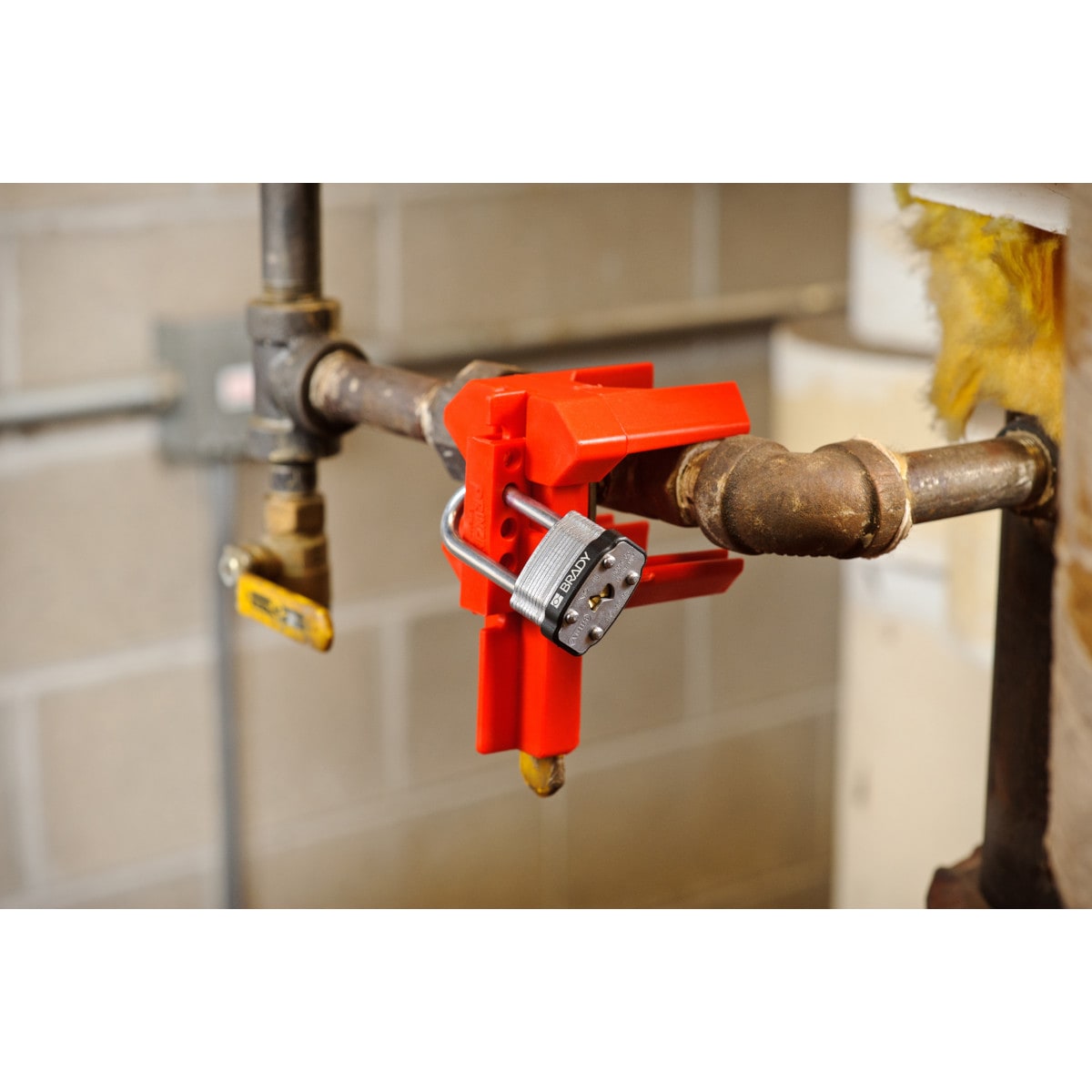 Le due metà del dispositivo racchiudono la leva per evitare che la valvola sia accidentalmente azionata. Blocca tubi da 12,70 a 31,75 mm in posizione di apertura e 12,70 a 63,50 di chiusura.
