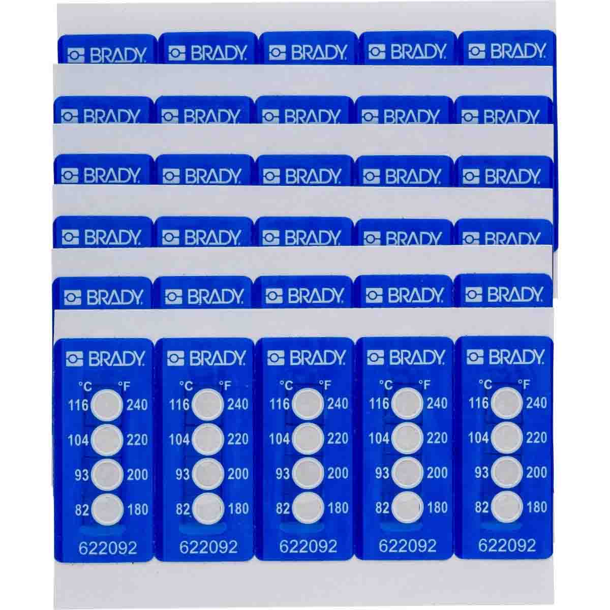 Serie di etichette indicatrici di temperatura (TIL) irreversibili, per la registrazione permanente della massima temperatura raggiunta da un’attrezzatura. Quando l’attrezzatura raggiunge una certa temperatura, l’area bianca dell’etichetta diventa irreversibilmente nera, dimostrando chiaramente il raggiungimento della massima temperatura. Etichetta 4 livelli, 82 °C/180 °F – 116 °C/240 °F