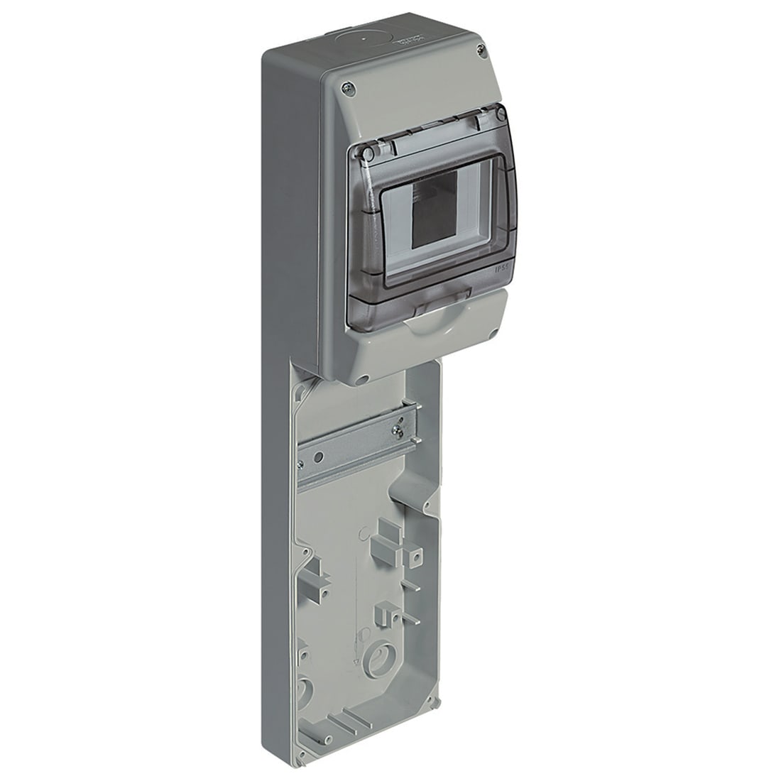 Base da parete per 1 presa interbloccata standard, IP66/IK08, dimensioni (AxL): 501x125mm. Predisposta con guida DIN35 da 4+1 moduli.