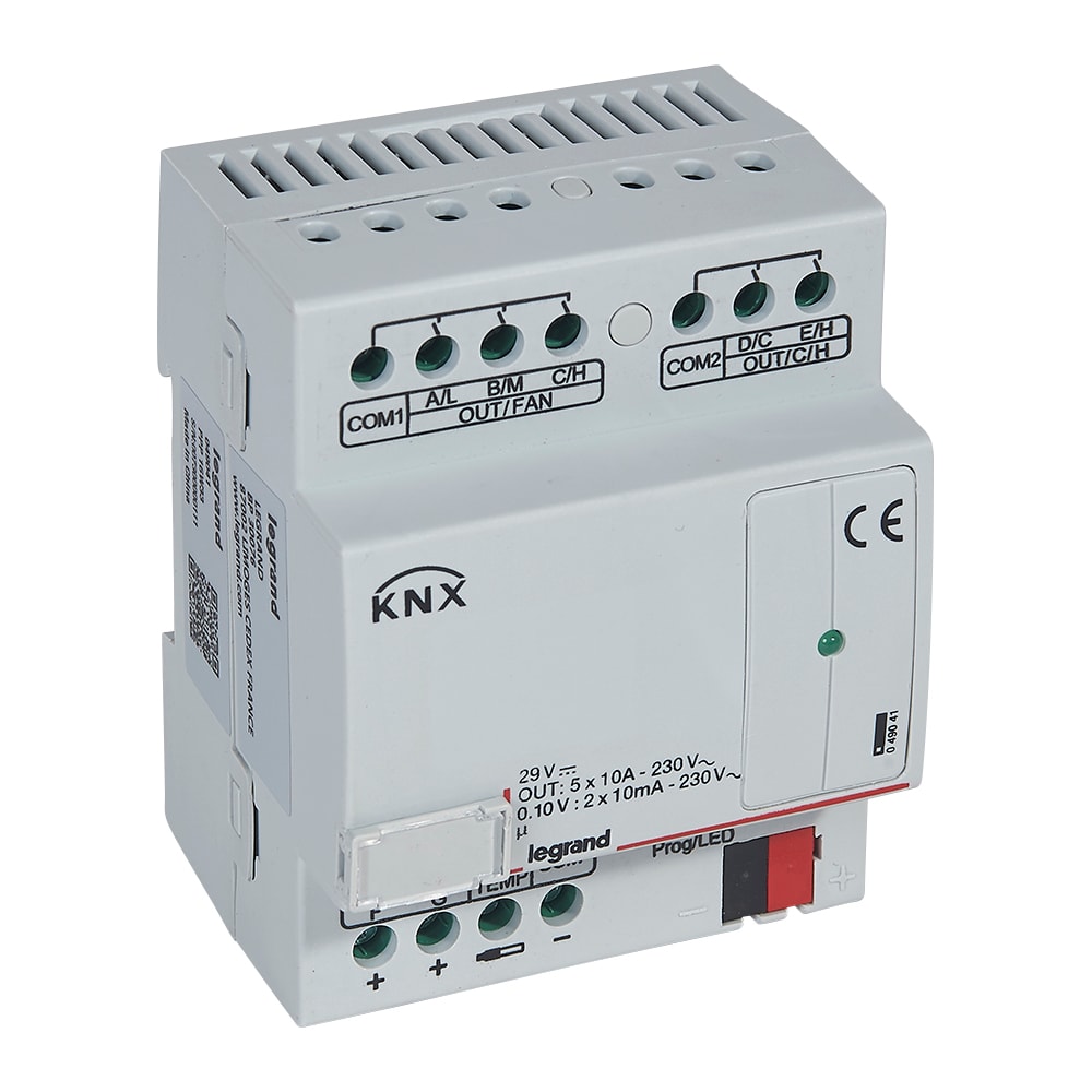 Controller KNX FCU 0-10 V DIN.Attuatore 0 – 10 V per gestire la termoregolazione e pilotare carichi come: FCU, ventole, valvole termostatiche, carichi elettrici.In combinazione con il pannello termoregolazione, può essere utilizzato per gestire la temperatura ambientale secondo le richieste dell’utente finale: modalità di funzionamento, regolazione della temperatura2 uscite 0-10 V d.c. per il comando di valvole termostatiche N (5 mA)5 uscite (relè) per il comando di ventole (3 velocità) e/o valvole termostatiche (10 A – 230 V a.c.)Temperatura di funzionamento -5 a 45°C. Tensione di funzionamento fornita dal bus KNXDimensioni 4 moduli DIN . Possibilità di alimentare le valvole 0 -10 V utilizzando il trasformatore 24 V a.c. art. 0 442 11. Connessione al bus tramite connettore KNX rosso-nero.