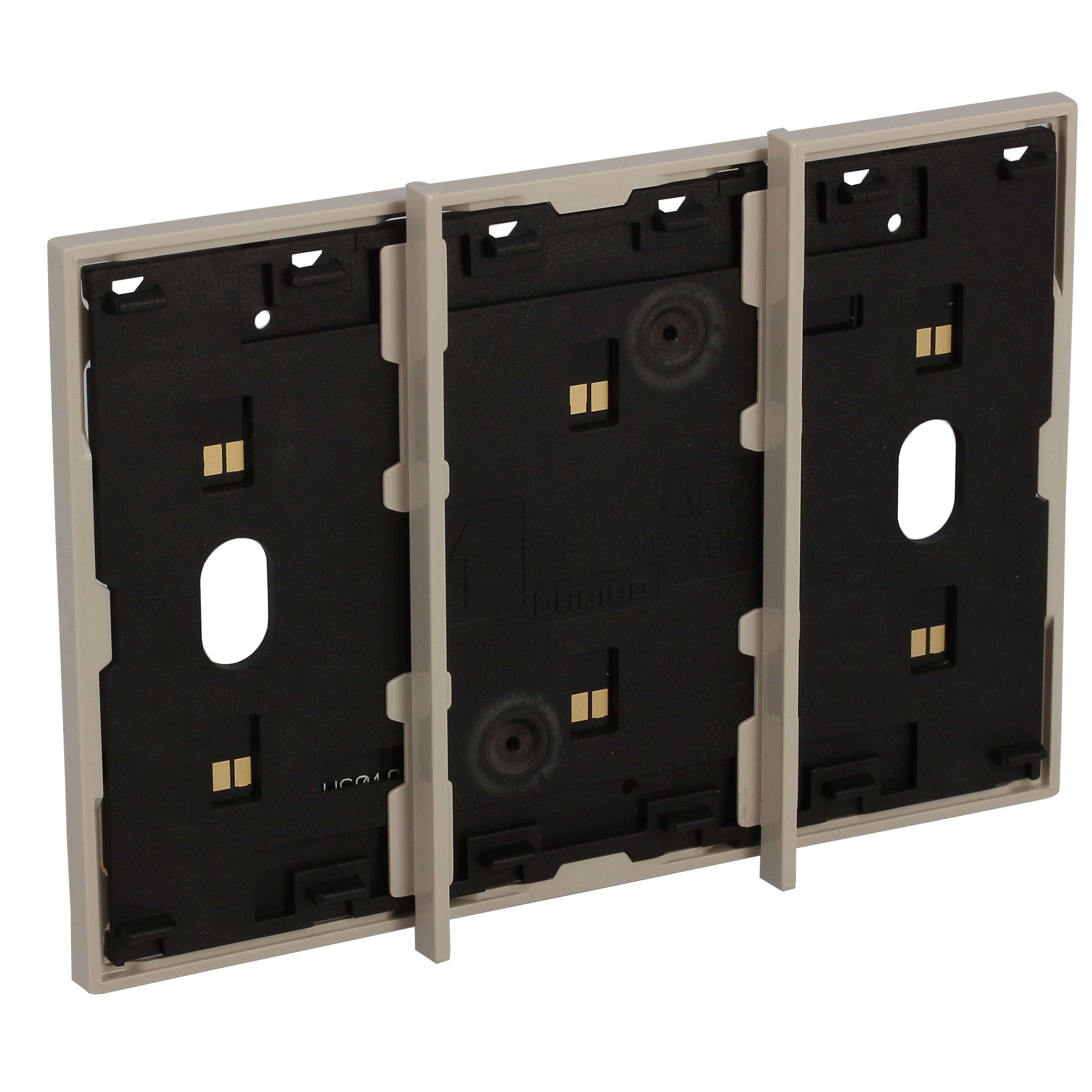 Frame elettrificato con barrette estetiche (rimovibili) di divisione tra i comandi. Per l’installazione di max. 3 comandi digitali o cover art. KW/KG/KM8100. Installazione in scatola da 3 moduli con supporto K4703. Colore sabbia.