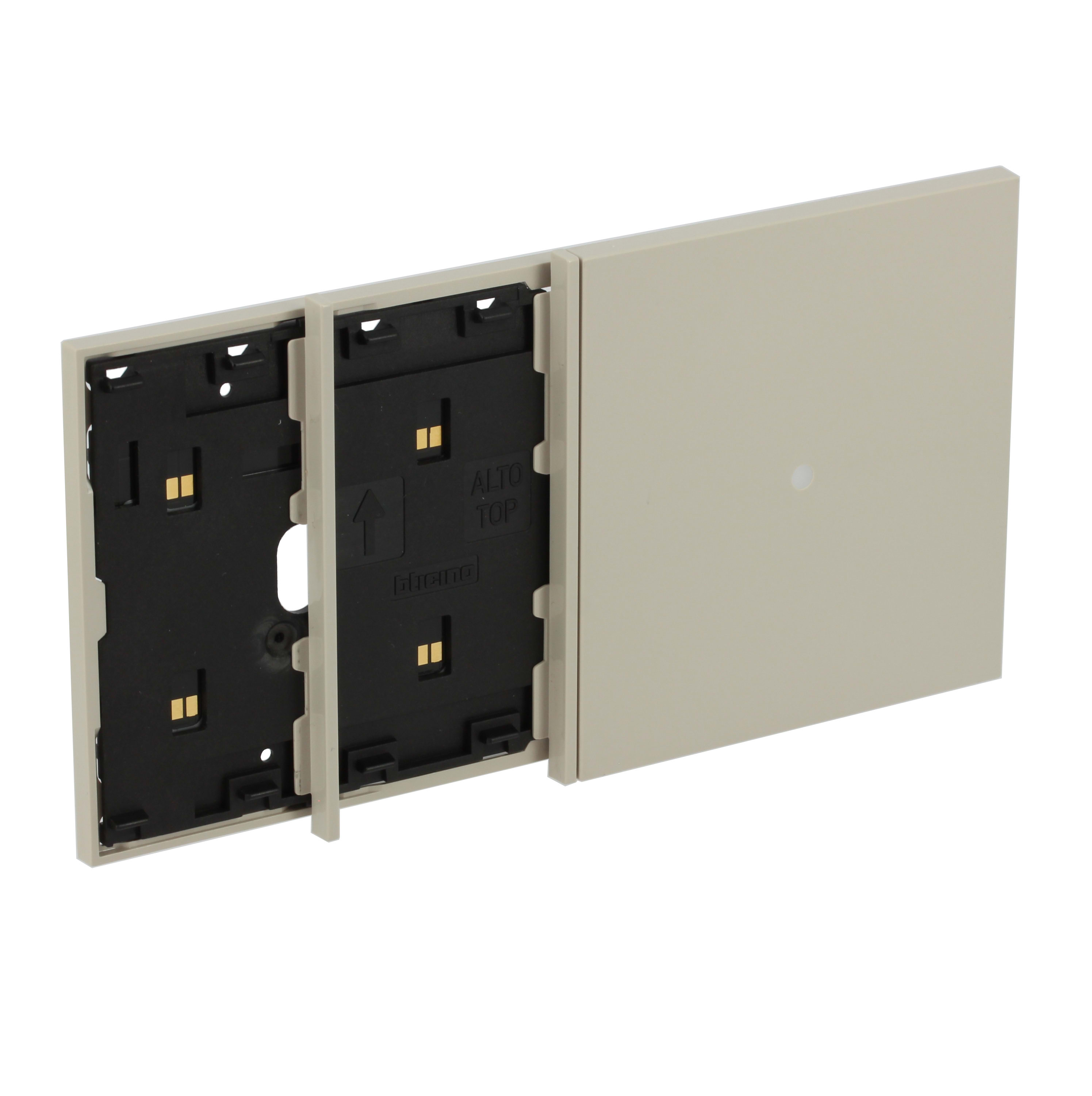Frame elettrificato con mostrina lettore antifurto, per l’installazione di 2 comandi digitali e del lettore antifurto (art. K4215). Installazione in scatola da 4 moduli con supporto K4704. Colore sabbia.