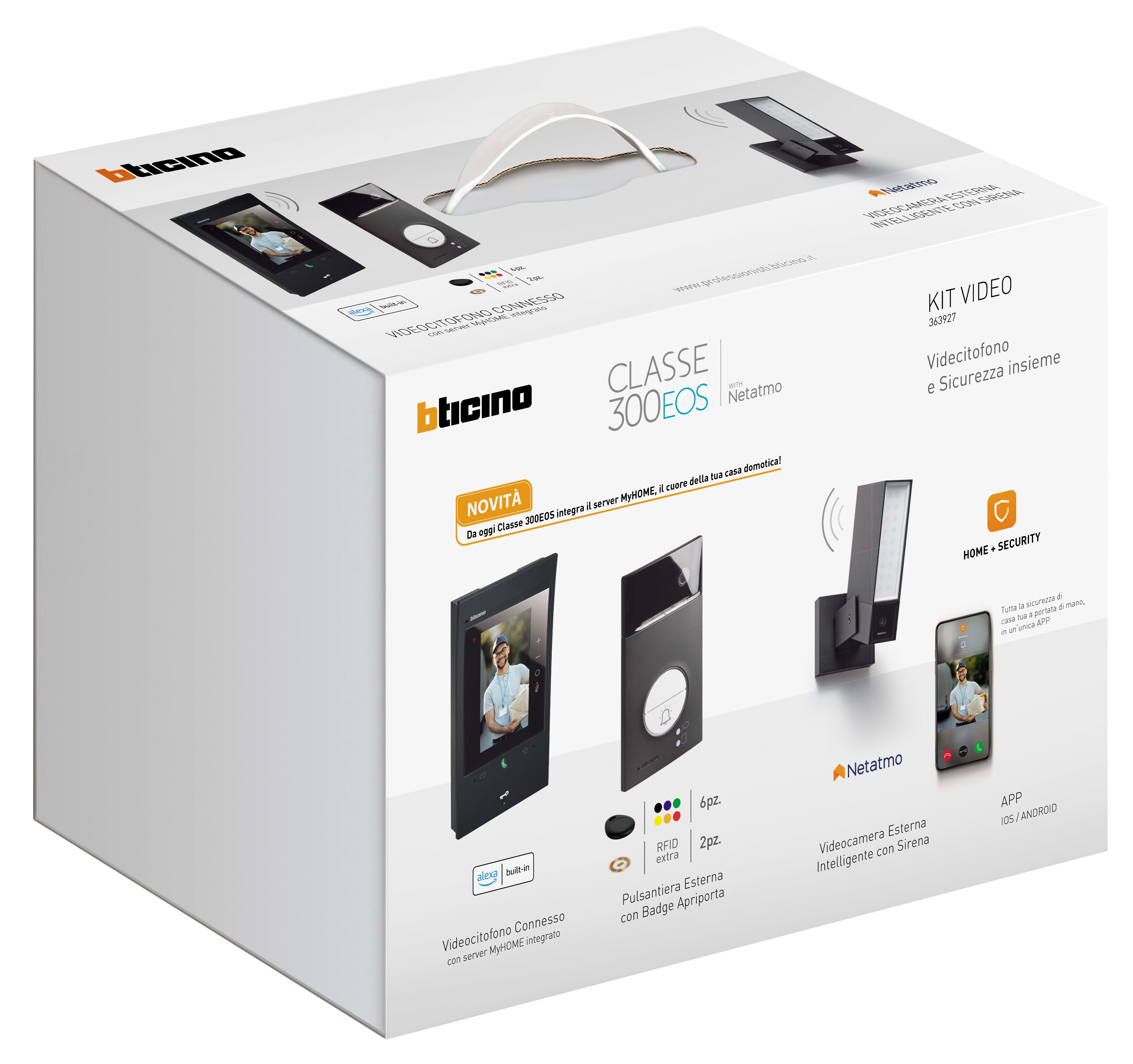 BTICINO - Kit video vivavoce connesso con pulsantiera Linea 3000 black, videocitofono Classe 300EOS black e videocamera Netatmo con sirena 363927