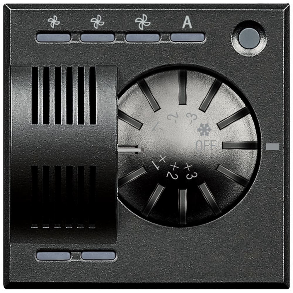 Sonda Axolute per il controllo della temperatura ambiente per impianti di riscaldamento e raffrescamento. Dotato di manopola per la variazione di ± 3°C rispetto alla temperatura impostata nella centrale e per la selezione delle modalità OFF e antigelo con selezione della velocità manuale/automatica per fan-coil e sistema Idrorelax - 2 moduli.