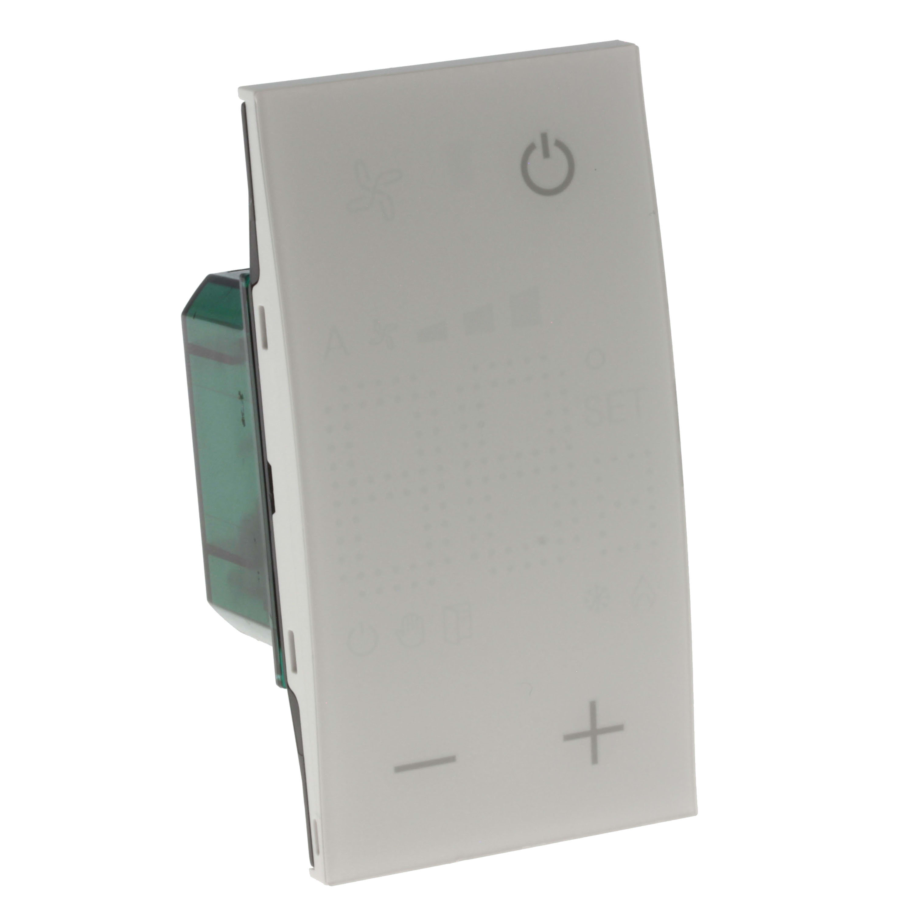 Sonda con display retroilluminato per il controllo della temperatura di una singola zona. È dotato di un ingresso per il collegamento di una linea contatti (es. contatto finestra). Permette la gestione di diverse tipologie di impianto e la regolazione della velocità della ventola in caso di impiego di fan coils. Possibilità di funzionamento automatico (estate/inverno) con impianti compatibili - 2 moduli, bianco