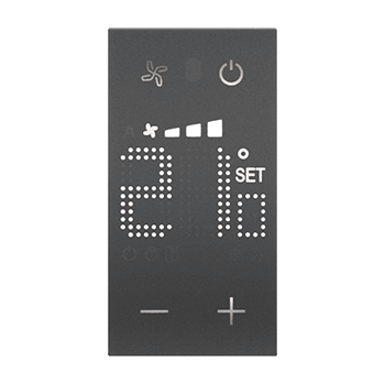 Sonda con display retroilluminato per il controllo della temperatura di una singola zona. È dotato di un ingresso per il collegamento di una linea contatti (es. contatto finestra). Permette la gestione di diverse tipologie di impianto e la regolazione della velocità della ventola in caso di impiego di fan coils. Possibilità di funzionamento automatico (estate/inverno) con impianti compatibili - 2 moduli, nero