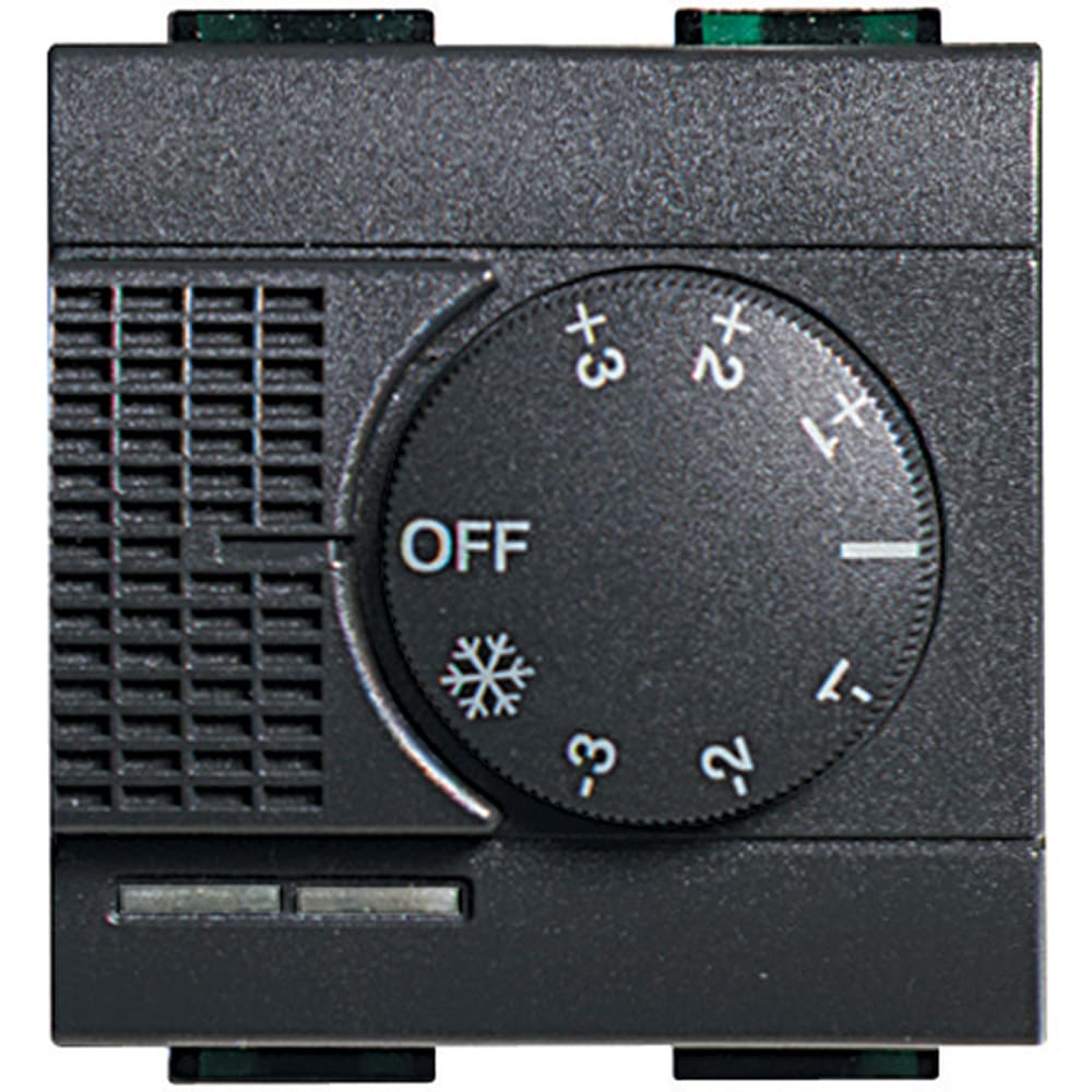 Sonda Livinglight per il controllo della temperatura ambiente per impianti di riscaldamento e raffrescamento. Dotato di manopola per la variazione di ± 3 °C rispetto alla temperatura impostata nella centrale e per la selezione delle modalità OFF e antigelo - 2 moduli.