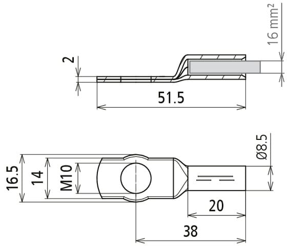 Capocorda a crimpare DIN 46235, sezione 16 mm² M10 rame/gal Sn con strato barriera in nichel. Per evitare la formazione di whisker nella zona a rischio di esplosione, si consiglia l’impiego di capicorda a crimpare stagnati con uno strato barriera in nichel.
