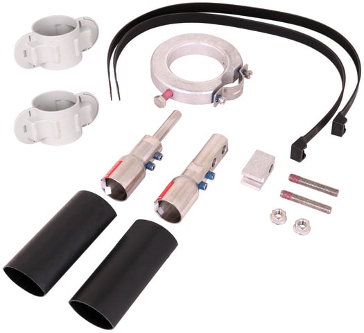 Set di connessione per conduttura HVI power per la posa nei tubi portanti HVI power in PRFV / Al costituito da elementi di connessione, barre filettate, elemento di connessione, tubo termorestringente, fascetta e anello di fissaggio con una staffa portafilo con fessura (Ø27 mm).